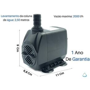 CARACTERISTICA - consumo de energia: 30W - voltagem:220v -vazão: 2000 litros hora - Altura máxima: 2,2 metros - Garantia 1 Ano