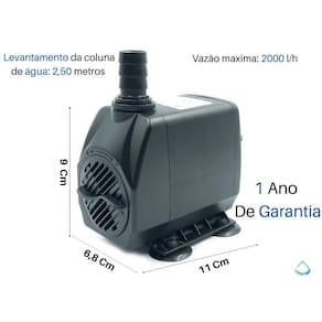 Bomba Submersa Wf 2000 Lh Aquários Fontes 220VBomba submersa WF 2000 litros hora 220V com controle de vazão.Essa bomba foi desenvolvida para trabalhar constantemente em seu aquário. Silenciosa e eficaz,a bomba produz movimentação de água, 2000 litros/hora, com baixo consumo de energia elétrica, apenas 30 watts.Como em todas as bombas, os componentes elétricos são totalmente imersos em resina epóxi tornando-as seguras contra choque elétrico mesmo trabalhando continuamente submersas.Seja ela de água salgada ou doce, fonte, chafariz, cascatas tanques ou até em lagos ornamentais.Sistema hidropônico, sistema de irrigação e uso geral de bombas de água. Motor confiável e de baixo ruído. Completamente submersível.Opção para eixo de aço ou cerâmica sem esforço.O pré-filtro requer menos manutenção.Possui regulagem de vazão da água.CARACTERISTICA- consumo de energia: 30W- voltagem:220v-vazão: 2000 litros hora- Altura máxima: 2,2 metros- Garantia 1 Ano