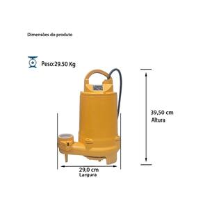 Bomba Centrífuga Submersível - Rotor semiaberto tipo Vortex Motor Trifásico 380v refrigerado a óleo hidráulico em II Polos, 60Hz, 3500rpm - Bocal com rosca BSP 2". Utilizada para drenagem de água com sólidos no diâmetro máximo de 2cm não fibrosos OBS.: Não utilizar em água potável devido ao óleo hidráulico. Carcaça, camisa e grade em ferro fundido GG-20. Rotor em ferro fundido GG-20. Anéis de vedação em Buna N. Selo mecânico: Faces em grafite e cerâmica. Mola em inox 304 e elastômero (borracha) em Buna N.