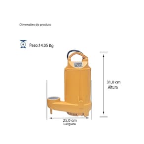 Residencial; Acompanha bóia elétrica: Não Acompanha válvula de retenção: Não Altura: 31 cm Altura manométrica total: 13,1 mca Ambiente Principal: Jardim e Varanda Composição: Carcaça, camisa e grade em ferro fundido GG-20. Rotor em ferro fundido GG-20. Anéis de vedação em Buna N. Selo mecânico: Faces em grafite e cerâmica. Mola em inox 304 e elastômero (borracha) em Buna N. Comprimento: 25 cm Conexão de entrada/saída: Bocal com rosca BSP 2" Ergonômico: Não Funcionamento: Elétrica Itens Inclusos: 1 Bomba Submersivel Largura: 25 cm Manual de Montagem e Instalação: https://product-hub-prd.madeiramadeira.com.br/964937084/documents/6172650c-2a8b-4f9b-87d9-b90089ba2f8c3050299578317515730833881.pdf Marca: EBARA Material Principal: Ferro Fundido Modelo: TSBD-250N 1/2 CV Necessita Montagem: Não Origem do Produto: Nacional Peso: 14,05 kg Potência do motor: 0,5 HP Profundidade de sucção: 13,1 m Recomendações de Uso, Manutenção e Limpeza: Verifique nosso Manual de Manutenção Temperatura Máxima da Água: 40 °C Tipo de Água: Água Limpa / Bruta / Efluentes Tipo de bomba de água: Submersível Vazão máxima: 13,5 L/h Voltagem: 220V