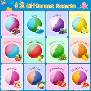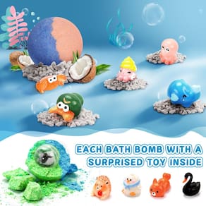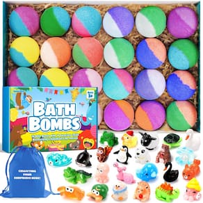 SeasonBliss Conjunto de 24 bombas de banho infantis com surpresa dentro, brinquedos de animais e bolas de fizz arco-íris, banho de espuma infantil, ótimo presente para meninas e meninos a partir de 3 anos, presentes de aniversário - [24 surpresas únicas]: Desembrulhe a emoção com 24 bombas de banho embaladas individualmente, cada uma ocultando um personagem de brinquedo colecionável diferente aninhado dentro de uma bola de plástico de 32 mm. A variedade de brinquedos garante uma surpresa com cada bomba de banho e diversão colecionável - [Delícia aromática e colorida]: Entregue-se a um banquete sensorial com 12 fragrâncias cativantes e 24 bombas de banho vibrantes de dois tons. As explosões coloridas de cor e aromas encantadores transformam a hora do banho em uma experiência caprichosa - [Suave na pele, diversão na banheira]: Feitas com ingredientes hidratantes e agradáveis à pele, as bombas de banho SeasonBliss são suaves o suficiente. Eles se dissolvem completamente, não deixando resíduos, apenas pele macia e perfumada e uma banheira cheia de espuma colorida - Armazenamento e organização convenientes: mantenha os brinquedos coletados bem guardados na bolsa de cordão azul incluída. Esta adição prática não apenas ajuda a evitar que os pequenos brinquedos se percam, mas também os mantém organizados e prontos para a próxima aventura na hora do banho - [Ótimo presente para entusiastas de banho infantil]: o conjunto de bombas de banho infantis é o melhor presente para crianças a partir de 3 anos. A combinação de brinquedos surpreendentes, aromas encantadores e benefícios para a pele macia o torna um presente verdadeiramente memorável e agradável