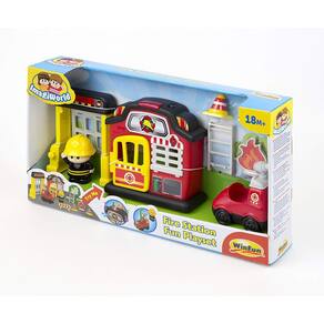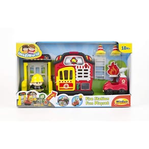 Inclui estação de bombeiros, bombeiro, caminhão de bombeiros, escada de incêndio, porta fechada e móvel, árvore, gato, fogo faz de conta , sinais e cones