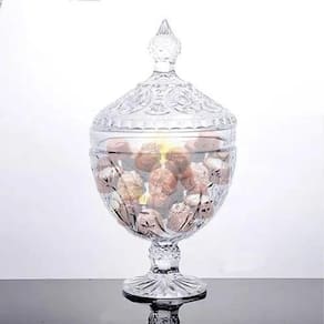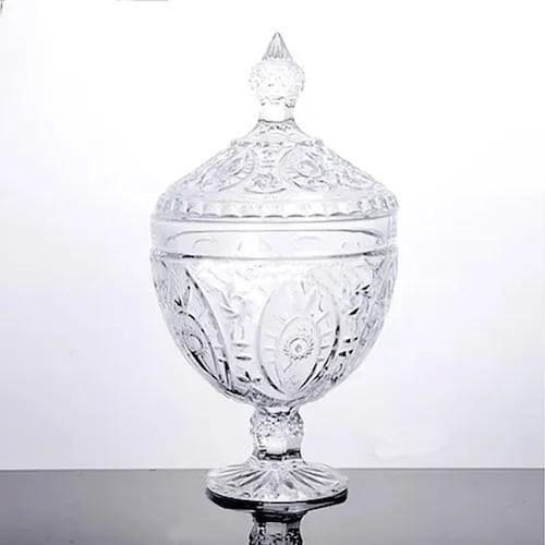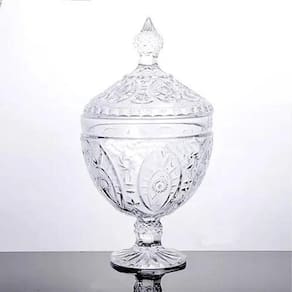 Com elegantes linhas e detalhes em relevo, esta linda bomboniere com tampa e pedestal ainda valoriza a decoração de seu ambiente.