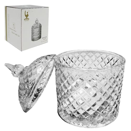 Bomboniere de vidro relevo com tampa 14x9,5cm de na caixa Ean: 7898702290385Validade: indeterminadaTamanho aproximado da bomboniere: 14x9,5cm de Tamanho aproximado da caixa: a:11,5xl:10,5cmPeso aproximado: 565gTipo de produto: bomboniere relevo com pé e tampa na caixaCor: transparenteComposição: vidro