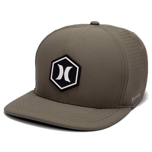 Boné Hurley H20-DRI, tecido leve com respirabilidade, patch frontal de borracha, heat transfer lateral refletivo, bordado na parte traseira, regulador traseiro e etiqueta bandeira ONE&ONLY.