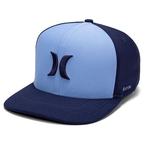 Boné Hurley H20-DRI, tecido leve com respirabilidade, bordado ICON 3D, heat transfer lateral refletivo, regulador traseiro e etiqueta bandeira ONE&ONLY.