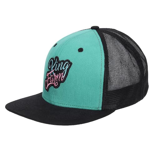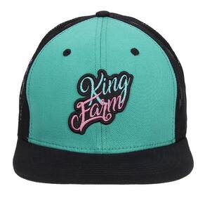 Boné King Farm aba reta, fabricado em tecido 100% Algodão nas cores Verde e Preta na parte frontal e 100% Poliéster na parte posterior na cor Preta em tela. Possui bordados na copa, aba costurada e fechamento em correia de plástico para regulagem.