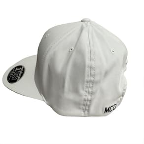 Boné Mcd com ilhós bordado, placa de metal logo MCD (frente), viseira plana, bordado plano MCD (atrás) e fecho em couro com fivela metal.