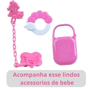 • Ela e feita com materiais de alta qualidade para garantir a segurança e durabilidade. Além disso, ela vem com acessórios como chupeta, chocalho e porta-chupeta, que vão tornar a brincadeira ainda mais realista e divertida.