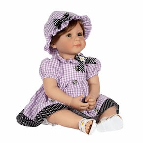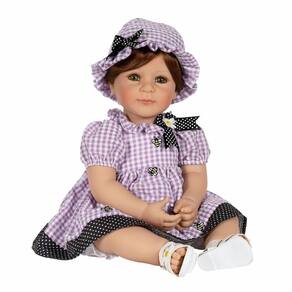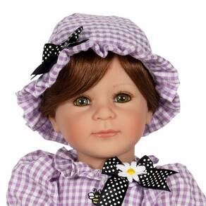 Da cabeça aos pés, ela está vestida para impressionar com suas roupas e acessórios realistas de boneca Seu conjunto inclui um vestido de algodão lilás feito à mão com abelhas bordadas, um chapéu combinando com laço, sandálias margaridas e calções brancos Bees Knees está pronta para pura diversão e diversão, enquanto corre com suas adoráveis botinhas brancas! A roupa dela é removível, então você pode trocá-la e vesti-la como quiser!