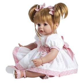 Ela é tão adorável com seu cabelo loiro arenoso e sedoso, olhos azuis pintados à mão, detalhes pintados à mão e cílios aplicados à mão 20 polegadas da cabeça aos pés feito de talco de bebê perfumado boneca de vinil de alta qualidade com cabeça, braços e pernas móveis