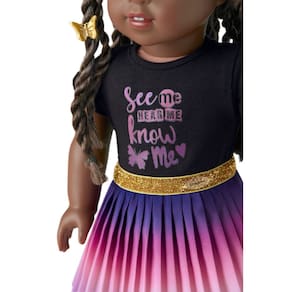 American Girl Boneca e livro World by Us Makena - Boneca Makena com olhos castanhos e cabelo castanho escuro texturizado de comprimento médio que vem em um estilo torcido - Uma saia plissada com estampa ombre rosa e roxa e cintura elástica com glitter - Uma camiseta gráfica preta com o ditado "See me, hear me, know me" - Três presilhas douradas de borboleta - Um par de sapatos rosa - O livro "See Me, Hear Me, Know Me" da Makena que inclui ideias para abordar preconceito racial, perfis de garotas reais e perguntas dos leitores