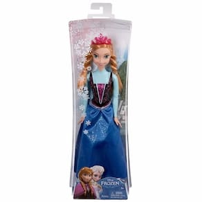 As adoradas irmãs do premiado filme Frozen, da Disney, Anna e Elsa, encantam com roupas brilhantes nas cores clássicas. Heroica, Anna, usa um corpete brilhante e todo detalhado, com saia longa, sua capa clássica e uma tiara da coroação. A linda e poderosa Elsa vem vestida com sua saia detalhada e brilhante com mangas reluzentes, sapatos e tiara. Ambas estão prontas para brilhar em um final feliz. As bonecas não ficam em pé sem apoio.