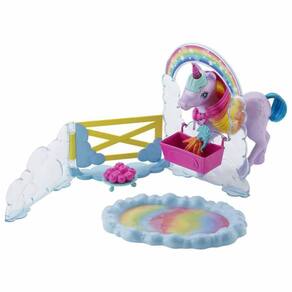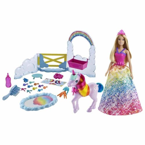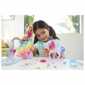 Boneca Articulada - Barbie Dreamtopia - Princesa com Unicórnio Arco-íris - Mattel: Este conjunto de brinquedos Barbie Dreamtopia estimula brincadeiras e diversão de contos de fadas com a boneca Barbie Princesa, seu unicórnio de estimação e um recurso mágico de mudança de cor. Inspirado por nuvens e arco-íris, o estábulo fantástico é o lugar perfeito para a boneca Barbie cuidar de seu unicórnio. UMA EXPERIÊNCIA MÁGICA: - Encha a mamadeira com água, coloque o bebê unicórnio no penico e ajude a boneca Barbie a alimentar seu animal de estimação. - Conforme o unicórnio "vai", a cor do penico vai mudar de branco para arco-íris! Deixe secar e repita para uma brincadeira sem fim. - Peças adicionais para brincar incluem uma gamela e lanches, uma escova de cabelo, uma escova de penteado para seu unicórnio e 10 acessórios de cabelo para brincar e se divertir no estilo. INFORMAÇÕES: - Produto: Barbie Princesa com Unicórnio Arco-íris - Marca: Mattel - Coleção: Barbie Dreamtopia - Tipo: Conjunto de Boneca com Acessórios - Tamanho: 30 cm (A) - Conteúdo: 1 Barbie, 1 Unicórnio e 15+ Acessórios - Recomendação: para crianças a partir de 3 anos de idade ESPECIFICAÇÕES: - Referência: GTG01 - Embalagem (C x A x L): 39.5 x 32.3 x 6.5 cm - Embalagem (Peso): 0.710 kg - Material / Composição: Plástico e Tecido - Registro: CE-BRI/INNAC-00128-05A-NM-300/2002 - Certificado: Órgãos Autorizados - OCP´S (Organismos de Certificação de Produtos) BENEFÍCIOS DE BRINCAR: - Eleva a autoestima - Exercita a memória - Estimula o raciocínio - Exercita o imaginário - Desenvolve a criatividade - Desenvolve percepção visual - Desperta a atenção e curiosidade - Desenvolvimento neuropsicológico - Estimula habilidades motoras básicas - Incentiva a comunicação e linguagem - Desenvolve aspectos emocionais e afetivo - Estimula o reconhecimento de formas e cores AVISO: - As imagens são meramente ilustrativas - Os tamanhos e medidas são aproximados - As cores e estampas dos produtos podem ter variações - As informações são de responsabilidade do fabricante ou fornecedor