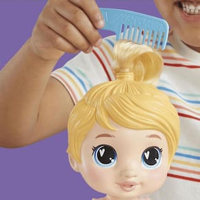 Dar banho na bebê: as crianças irão se divertir na hora do banho com sua nova amiga Frasco com bolhas mágicas: basta inclinar o frasco para ver as bolhas de mentirinha subirem e descerem as crianças podem brincar com o frasco com água ou shampoo infantil Boneca de 28 cm resistente à água: a boneca de 28 cm é ideal para abraçar e carregar por aí Enrolar na toalha: enrolar a boneca na toalha macia com fechos para encaixar Pentear cabelo: as crianças podem brincar de criar penteados com o pente e laço removível.