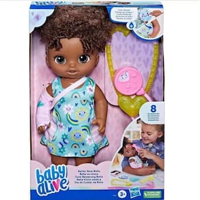 Boneca Baby Alive Dia de Cuidar da Bella Negra Hasbro F7537 A boneca Baby Alive Dia de Cuidar da Bella precisa de amor e cuidados especiais A boneca veste um lindo vestido verde comestampa de florzinha, seus cabelos estão presos que a deixam ainda mais estilosa.
