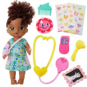 Conteúdo da embalagem: 1 Boneca Baby Alive de aproximadamente 30 cm, 1 Estetoscopio, 1 Pente, 1 Verificador de ouvido, 1 Termômetro, 1 Chapa de raio-x e 1 Gesso. Código de barras: 5010996128232 Referência: F7537 Idade recomendada: A partir de 3 anos de idade. Aviso importante: As cores podem variar entre as imagens e produto. Imagens meramente ilustrativas. Homologação Inmetro: 08950-02/2021 Ean: 5010996128232