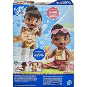É a primeira boneca Baby Alive que pode comer e brincar dentro da água. Basta remover a comida sólida para boneca da boneca Dia na praia para prepará-la para entrar na água. As crianças podem usar a comida para boneca reutilizável incluída e o molde de picolé para criar um picolé de mentirinha. A fralda de plástico da boneca pode ser aberta para limpar a caquinha. A boneca Baby Alive Dia na praia inclui traje banho e canga, óculos de sol, sandálias, 2 potes de comida sólida para boneca, molde de picolé e palito, colher-garfo e pente. A boneca Baby Alive Dia na praia traz muitas maneiras de brincar.
