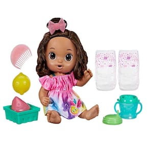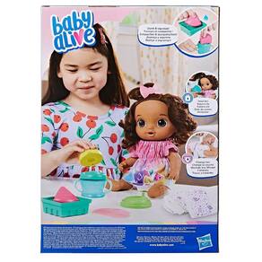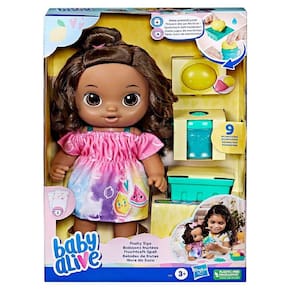 Com o kit Baby Alive Hora do suco, as crianças podem brincar de fazer sucos para a boneca e alimentá-la com a mamadeira incluída. Vem com uma máquina de sucos de mentirinha e 2 frutas de plástico (limão siciliano e melancia). As crianças podem mergulhá-las na água e depois espremer na máquina. Vem também com uma cesta de frutas. Basta trocar a tampa da máquina de sucos com a tampa da mamadeira para poder alimentar a boneca. Depois do suquinho, é hora de trocar a fralda (fraldas para bonecas adicionais vendidas separadamente).Especificações: Fabricante: HasbroRef.: F7357Cód. Barras: 5010996116581Idade recomendada: +3 anos.Dimensões da embalagem (AxLxC) 37x25x10 cmPeso: 0,718 kgGarantia do vendedor: 7 diasGarantia do fabricante: 3 meses