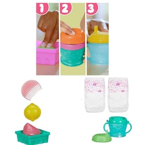 Com o kit Baby Alive Hora do suco, as crianças podem brincar de fazer sucos para a boneca e alimentá-la com a mamadeira incluída. Vem com uma máquina de sucos de mentirinha e 2 frutas de plástico limão e laranja . As crianças podem mergulhá-las na água e depois espremer na máquina. Vem também com uma cesta de frutas. Basta trocar a tampa da máquina de sucos com a tampa da mamadeira para poder alimentar a boneca.