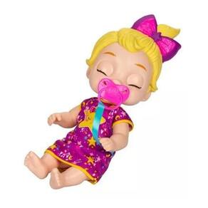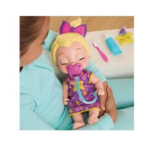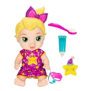 Boa noite, pequenina As crianças podem brincar de preparar esta linda boneca de 28 cm para a hora de dormir. A boneca fecha os olhos quando recebe a chupeta. A chupeta fica presa ao pijama para não se perder. As crianças podem contar lindas histórias com a marionete de dedo em formato de estrela e brincar de escovar os dentes com a escova de dente de brinquedo e a pasta de dente de mentirinha. Este kit de boneca bebê é um excelente presente para meninos e meninas.