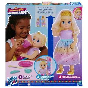 Dê carinho e cuide da boneca, aos poucos você poderá acompanhar seu crescimento com diferentes sons em cada fase e vê-la se transformar em princesa, esse então é o momento de colocar a coroa e os longos cabelos, a princesa fica ainda mais surpreendente com seus 75 sons e frases em Português e acessórios para completar a brincadeira, tornando tudo ainda mais real. Esta boneca Baby Alive tem 37cm inicialmente e cresce lentamente quando as crianças usam seus acessórios como: chupeta, copo com canudinho e tigela com colher. A boneca irá crescer lentamente com as brincadeiras e ao se alimentar.