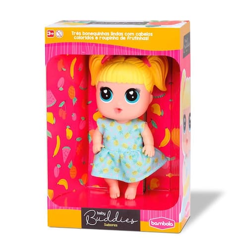 Boneca Baby Buddies Sabores Abacaxi Cabelinho colorido e roupinha com estampa de frutas A Boneca Bambola Baby Buddies Sabores Abacaxi é linda e divertida. Impecável, ela é fabricada em vinil atóxico, material seguro para crianças a partir de 3 anos. Cheia de estilo sua roupinha com abacaxi estampado deixa esse bebê ainda mais fofo. Certificado nº: 5433/2020-BRI-13 Ean: 7899871706943