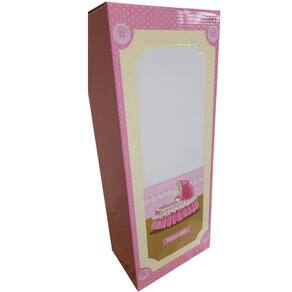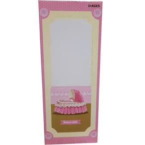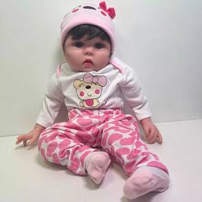 A boneca é a figura central, com uma expressão calma e olhar gentil. Ela tem cabelo escuro e um chapéu rosa com um laço. Ela está vestida com um macacão de manga comprida branco com um desenho de um urso e calças rosa com estampa de corações.