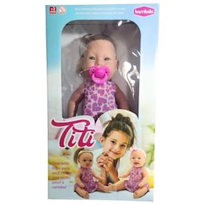 Boneca Titi com Cabelo Loiro 34cm Titi é uma boneca simples!, como devem ser todas as coisas da vida! Como toda criança, gosta de ser cuidada com muito amor, carinho e dedicação! Informações: - Ref.: 824 - Marca: Bambola - Modelo: Titi com Cabelo - Material: Plástico, Vinil e Tecido - Material Corpo: Vinil - Tamanho ideal para brincadeiras de cuidado - Código de barras (EAN): 7899871708244 - Altura Aproximada: 34 cm - Certificação: 7789-2023-BRI-1M - Recomendado para crianças maiores de 03 anos de idade. Conteúdo da Embalagem: - 1 Boneca - 1 Chupeta Uma ótima opção para incentivar a imaginação, responsabilidade e carinho das crianças.