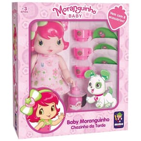 Especificações Técnicas: Marca: MIMO Modelo: Boneca Baby Moranguinho Chazinho da Tarde Acessórios: 3 pratinhos, 3 xícaras, 1 chupeta e 1 mamadeira Idade Recomendada: +3 Anos Material: Plástico
