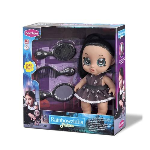 Uma bonequinha bem diferente, com seu jeito sombrio que a torna tão envolvente. Rainbowzinha, a princesinha macabra que encanta a todos com seu charme peculiar vem com pente, espelho e escova, para você fazer lindos penteados