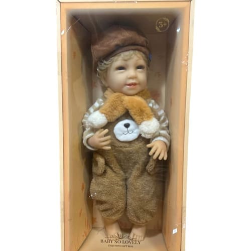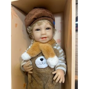 A Boneca Baby So Lovely é perfeita para quem busca fofura e realismo em um só produto. Com aproximadamente 45cm de altura, ela possui cabelos loiros cacheados, expressão sorridente e olhos delicados. Vem vestida com um macacão de ursinho marrom super macio, blusa listrada e uma boina estilosa que completa seu visual encantador.