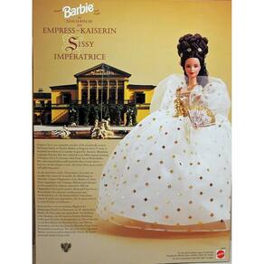 Prepare-se para um presente real. É uma boneca Barbie de edição limitada, inspirada na Imperatriz Sissy da Dinastia Habsburg-Lothringen da Áustria. Seu traje foi recriado a partir de uma pintura do século 19 e apresenta um corpete de cetim justo, decorado com lantejoulas e miçangas e uma luxuosa trança dourada. A parte de trás do vestido é costurada à mão com pequenos botões de “pérola falsa”. De suas calças e sapatos com acabamento em renda, até seu delicado leque, até seu cabelo escuro trançado com strass, ela é quase uma imperatriz.
