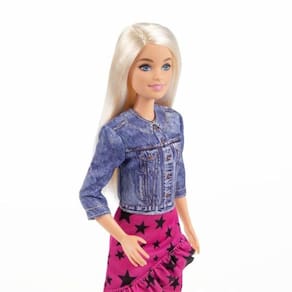A boneca Barbie usa uma jaqueta inspirada em jeans e uma saia estilosa com estampa estrelada e detalhes em babados. Sapatos casuais brancos são perfeitos para explorar a cidade, e uma bolsa preta estilosa completa seu visual moderno. Crianças de 3 anos ou mais vão adorar sonhar com suas próprias grandes aventuras com bonecas e brinquedos Barbie Cada um é vendido separadamente, sujeito à disponibilidade. Cores e decorações podem variar.