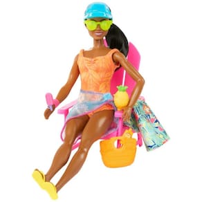 - Vestida para se divertir na praia, a boneca Barbie Brooklyn usa maiô e sarongue com acessórios de praia