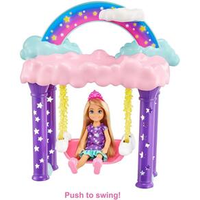 Os conjuntos de jogos Barbie Dreamtopia Chelsea apresentam peças grandes e acessórios temáticos que definem o cenário para um dia de jogo encantado.