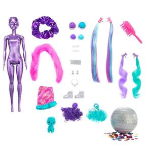 Mas as surpresas não param por aí. Abra a parte superior do tubo e retire uma boneca coberta da cabeça aos pés com glitter roxo Color Reveal. Continue desempacotando para encontrar um amigo de estimação e 10 mechas de cabelo coloridas que podem ser misturadas e combinadas entre a boneca e o animal de estimação, perfeito para criar diversos visuais e mudá-los sempre que quiser.