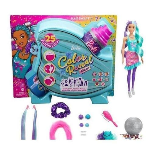 Boneca Barbie Color Reveal Penteados de Festa 25 Surpresas Série Glitter Azul Com Pet - Mattel - HBG41As bonecas Barbie Color Reveal Pentados de Festa proporcionam a derradeira experiência de desembalagem com 25 surpresas - abra o painel frontal para encontrar 15 bolsas misteriosas que escondem surpresas dentro e um tubo Barbie Color Reveal inspirado em uma garrafa de spray de cabeloRemova a boneca Barbie Color Reveal coberta de purpurina do tubo, encha o tubo com água morna, insira a boneca e gire-a.A água muda de cor com glitter cintilante flutuando para um efeito mágico.Quando a boneca é puxada, seus traços são revelados As surpresas adicionais incluem 10 peças de cabelo, um amigo de estimação, modas, acessórios, uma bola de discoteca com confete e muito mais.Jogue diferentes transformações de penteado com a boneca Barbie e seu amigo de estimação usando as peças de cabelo plug-in.Crie um visual e troque-o.Muitos penteados legais para tentarE as surpresas continuam... Use água gelada para ativar os recursos de mudança de cor, como nos lábios e olhos da boneca Barbie e no rosto do animal de estimação.Com o uso de água morna e gelada, as crianças podem repetir os momentos de mudança de cor ininterruptamenteCada um é vendido separadamente, sujeito à disponibilidade.