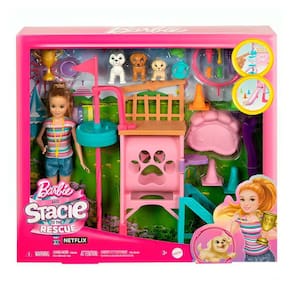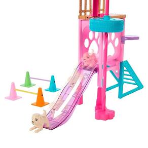 Divirta-se com este conjunto de pista de obstáculos para cachorrinhos! Com mais de 20 peças, as crianças podem brincar de diversas maneiras com a boneca Stacie e seu grupo de três cachorrinhos Os cachorros podem descer pela torre de pneus, escorregar pelo escorregador, pular através de aros e muito mais neste playground para construir Inspirado no filme Barbie e Stacie ao Resgate, as crianças podem ajudar a Stacie a treinar e cuidar de seus amigos peludos Acompanha acessórios como brinquedos para cães, guloseimas, um troféu e uma cama