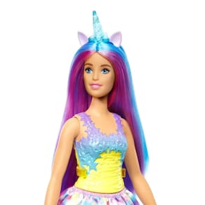 Descubra um mundo mágico com a Barbie™ Dreamtopia Unicórnio! A Barbie® tem um visual vibrante com cabelos azuis e roxos, corpete brilhante e saia removível com estampa de nuvens e arco-íris. Com cauda de encaixe e tiara brilhante de unicórnio com orelhinhas, as crianças transformam a Barbie® em uma criatura saída diretamente dos contos de fadas! Os sapatos coloridos e as meias-calças pintadas inspiram ainda mais diversão. Com visuais vibrantes e uma transformação fantástica, a Barbie™ Dreamtopia Unicórnio inspira contos de fadas para crianças a partir de 3 anos. Vendidos separadamente, sujeitos a disponibilidade. A boneca não fica em pé sozinha. As cores e as decorações podem variar.?