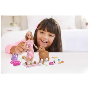 A adorável cadela de estimação da boneca Barbie tem filhotes a caminho, e as crianças podem ajudar a recebê los com o playset Barbie Newborn Pups Pressione as costas da mamãe cachorra para ajudar a boneca Barbie a dar à luz um cachorrinho e pressione novamente para dar as boas vindas a mais 2 Encha a banheira com água gelada, mergulhe a toalha e passe a pelos filhotes para revelar uma marca de nascença especial em cada um Um porta cachorros tem espaço para os três filhotes, então a boneca Barbie pode cuidar deles em qualquer lugar. Expanda a narrativa com acessórios adicionais, incluindo uma garrafa, duas escovas, brinquedo de corda, duas guloseimas, um saco de comida de cachorro e uma tigela. Com tantos acessórios nutritivos e oportunidades para contar histórias, o playset Barbie Newborn Pups é um ótimo presente para os amantes de animais de 3 a 7 anos de idade Marca: Não Informado