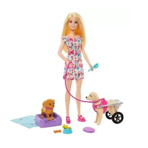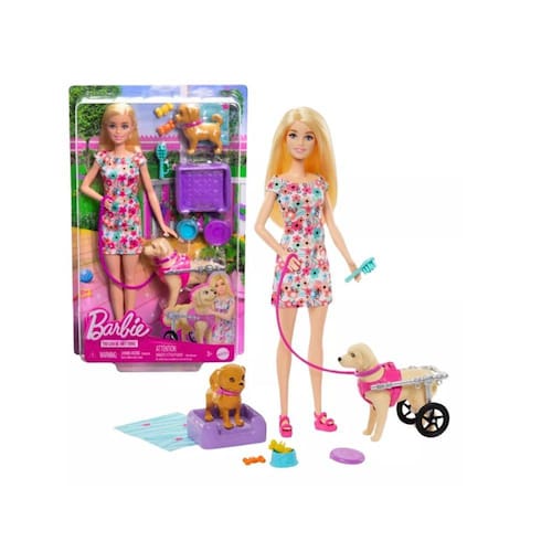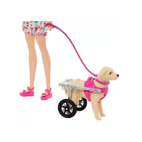 Você vai apaixonar-se por este conjunto de Barbie e os seus dois cachorrinhos! Este conjunto de animais de estimação vem com um cachorro e um cão maior que serve como uma cadeira de rodas para caminhar de verdade. Estes dois amigos cães adoram passear com a Barbie! Os meninos e as meninas podem tirá-lo e voltar a colocar a cadeira de rodas no cãozinho, pois precisa de uma dose extra de amor e cuidados.Os acessórios para animais de estimação incluem uma trela que se adapta às mãos do pulso, uma tigela para comida, uma cama para animais de estimação e deliciosas guloseimas em forma de ossos.Meninos e meninas a partir dos 3 anos podem ajudar a boneca Barbie a cuidar dos seus amiguinhos cães.