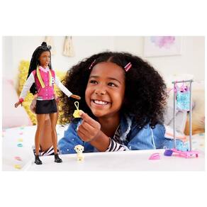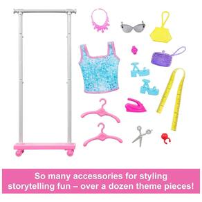 Este playset de boneca e acessórios Barbie apresenta um tema de estilista no set de Barbie e Barbie On Set e inspira as crianças a escrever seus próprios scripts para diversão na hora de brincar A boneca Barbie Brooklyn está cuidando do guarda roupa com 14 peças temáticas que incluem um cachorrinho, cabideiro e itens para contar histórias como top, sapatos, 2 bolsas e fita métrica Algumas das peças têm alças que cabem nas mãos da boneca para mergulhar a imaginação na diversão de dramatizações e histórias Use o rack e os cabides para pendurar as roupas e inventar looks A boneca Barbie Brooklyn usa seu cabelo preto em um coque parcial com tranças e tem um visual moderno com jaqueta do time do colégio Com muita inspiração criativa, este playset no set é um ótimo presente para crianças de 3 anos ou mais, especialmente aquelas que adoram estilo e diversão na moda