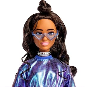 -A Barbie usa óculos escuros azuis, uma bolsa de cristal e botas prateadas como acessórios.
