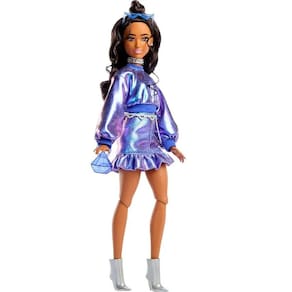 -Esta boneca Barbie é a definição de metálico com um outfit brilhante! Seu suéter azul gelo e cropped combina perfeitamente com uma saia de babados