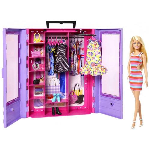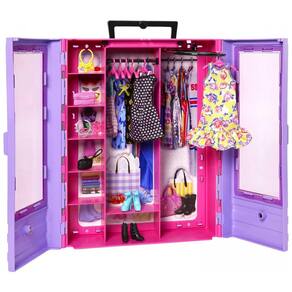 O playset Barbie Ultimate Closet inclui bonecas, roupas e acessórios Barbie e tem estilo por dentro e por fora O armário tem um exterior roxo com um interior rosa e está decorado com portas duplas claras para um vislumbre do guarda roupa da boneca Barbie Um rack dobrável é para pendurar roupas e é útil para mudanças no estilo de vestir. Seis cabides também estão incluídos. A boneca Barbie usa um vestido listrado e tem dois vestidos adicionais para trocar de roupa. Três pares de sapatos, dois colares e duas bolsas criam olhares diferentes em um instante Uma alça de transporte facilita a zenagem ou a viagem Misture e combine para jogar moda e diversão de estilo