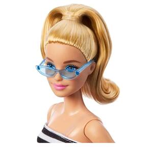 A boneca Barbie celebra 65 anos de estilo inconfundível com releituras modernas de looks icônicos e muitos detalhes exclusivos! Inspirada em seu icônico primeiro maiô de 1959, a boneca Barbie Fashionistas veste um top listrado em preto e branco e uma saia rosa com babados. Sandálias pretas de tiras e óculos de sol azuis estilosos criam um visual clássico e moderno ao mesmo tempo! Seus cabelos loiros estão presos em um rabo de cavalo alto, perfeito para qualquer ocasião! Com infinitas possibilidades de estilo e histórias, as bonecas tem um corpo voluptuoso e longos cabelos azuis lisos, para um visual casual e moderno!
