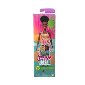 A Barbie Loves The Ocean Vestido Listrado faz parte da coleção sustentável de bonecas, confeccionadas com plásticos reciclados. A Barbie vem com um visual de verão, vestindo um vestido listrado cheio de estilo.