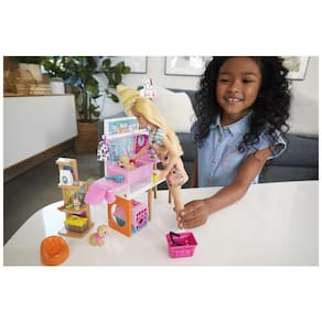 O playset boutique de animais de estimação da Barbie é o sonho de qualquer amante de animais com 4 animais de estimação, uma estação de cuidados, balcão de check out e mais de 20 peças temáticas. O playset pode se transformar em segundos levante o balcão para revelar uma pia onde a boneca Barbie pode cuidar de seu cachorro. Para ativar o recurso de mudança de cor do filhote, mergulhe a esponja incluída em água morna e lave para levá lo de sujo a limpo repita várias vezes. O conjunto possui prateleiras e zenamento para acessórios, incluindo guloseimas, brinquedos e ferramentas de limpeza. Ajude a boneca Barbie a comprar as necessidades do animal de estimação ou até mesmo adote um amigo animais de estimação adicionais incluem um gatinho, um hamster e uma tartaruga. A boneca Barbie usa um vestido casual com estampa inspirada em cachorrinhos e tênis fofos. Com tantos recursos e acessórios divertidos, este playset da loja de animais da Barbie é um ótimo presente para crianças de 3 a 7 anos, especialmente aquelas que amam animais Marca: Não Informado