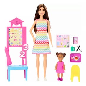 Você pode ser uma professora com o conjunto de professores da Barbie! Este conjunto inclui Barbie e seu adorável estudante de boneca de criança com peças de jogo com tema de carreira! Com o acessório do conselho de ensino, a Barbie pode ensinar seu aluno com o conjunto de adesivos inspirados no ensino.